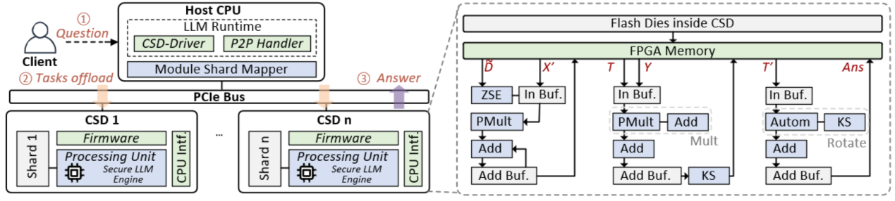 针对基于同态加密的隐私信息检索系统在大规模部署中普遍存在的高延迟与低吞吐问题,论文提出了创新系统 SmartPIR。该系统通过协议–架构协同设计(co-design),在隐私信息检索领域率先实现了密态计算与存储的深度融合:将核心同态运算下沉至计算存储设备(CSD)内部执行,从根本上减少了数据传输与处理开销。借助这种架构层面的重新分工,SmartPIR 能在保持严格隐私保障的同时显著提升系统整体性能。实验结果表明,SmartPIR 在商用 CSD 平台上实现了较现有 CPU/GPU 方案 高出 1–2 个数量级的加速效果,为隐私计算系统的实际落地与可扩展部署提供了一种全新的体系结构范式。