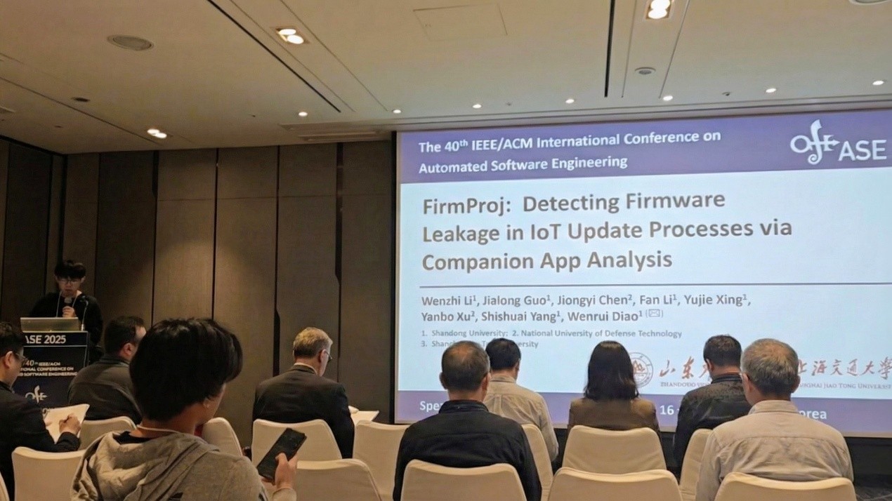 近日,第40届 IEEE/ACM 自动化软件工程国际会议(ASE 2025)在韩国首尔召开。山东大学网络空间安全学院在物联网安全方向的最新研究成果被大会录用并作口头报告。该论文是山东大学首次以第一作者单位在 ASE 会议发表的研究成果,论文共同第一作者为学院研究生李文智和郭嘉龙,通讯作者为刁文瑞教授。