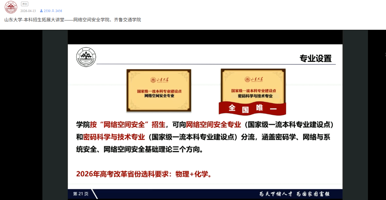 4月13日,山东大学2026年“本科招生拓展大讲堂”之网络空间安全学院专业宣讲直播活动顺利举行。网络空间安全学院副院长胡思煌教授做客直播间,面向全国考生及家长系统介绍了学院办学实力与专业特色,并在线解答了招生热点问题。