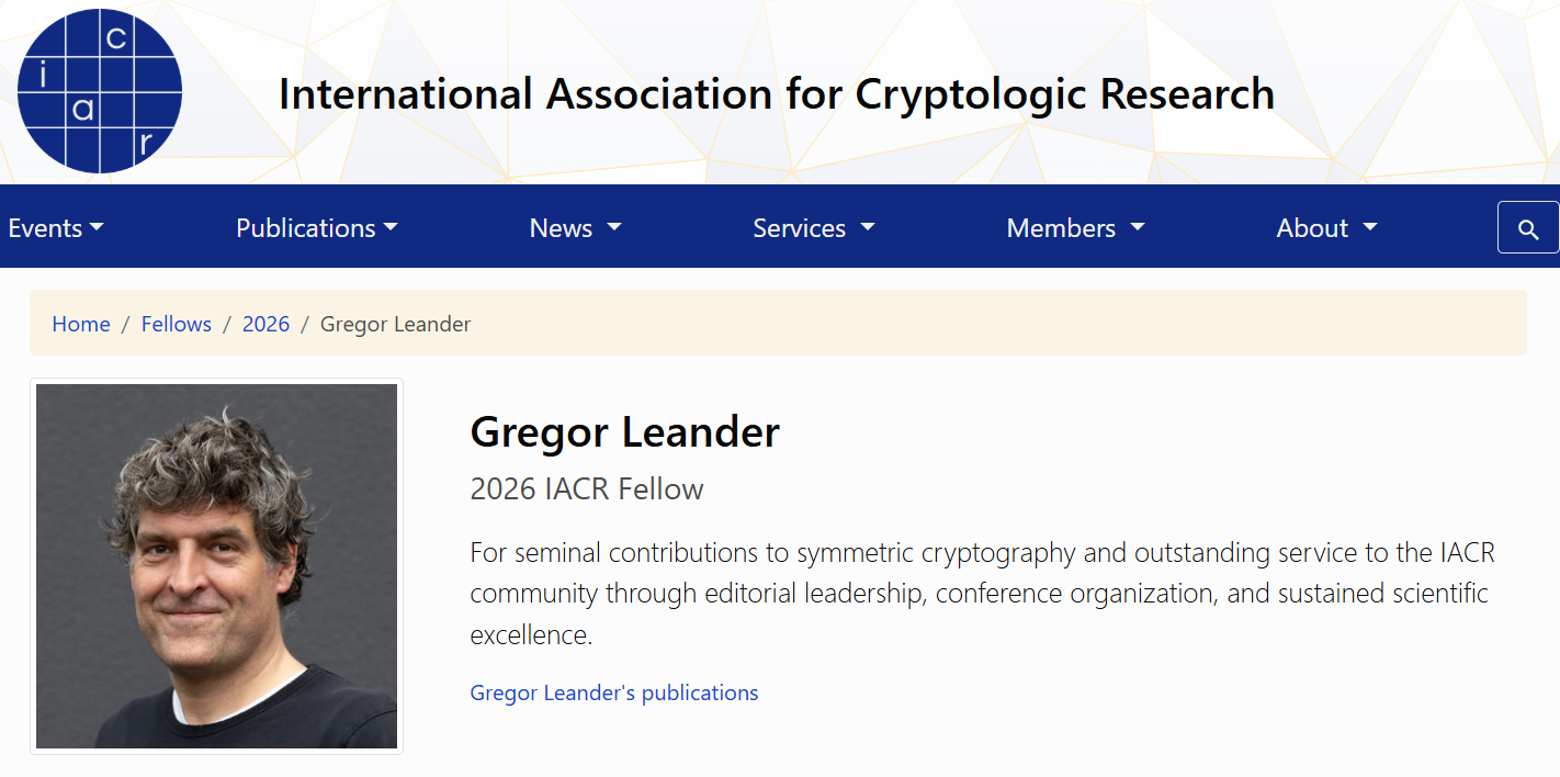近日,国际密码研究协会会士增选名单公布,山东大学名誉教授、国际知名密码学家Gregor Leander教授当选为2026年度国际密码研究协会会士。